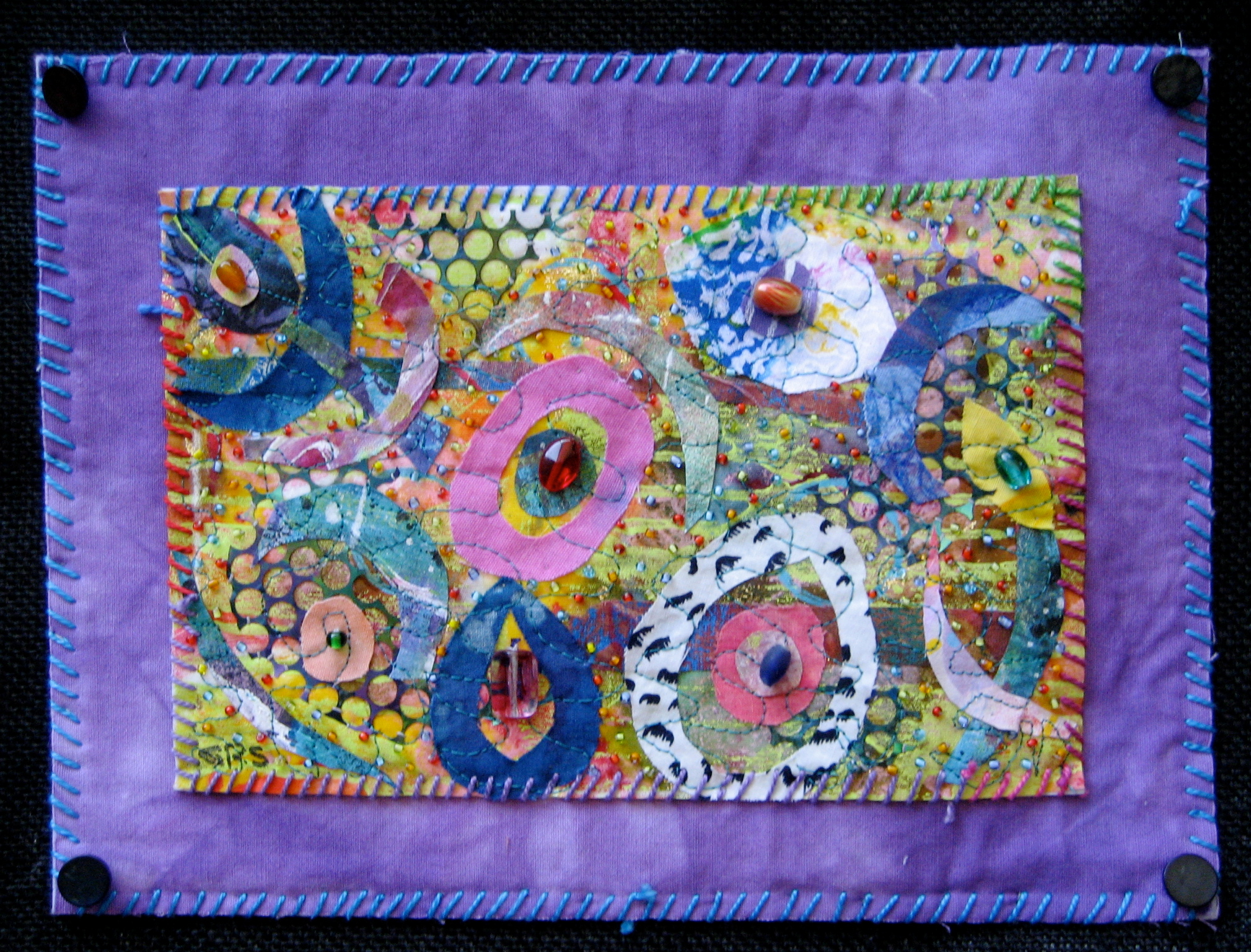 Lined Jute Tote Bag made by Buckhead Betties. Attached is an orginial piece of fiber art made by Susan R. Sorrell. Artwork and bag have been sealed with Scotts Guard.