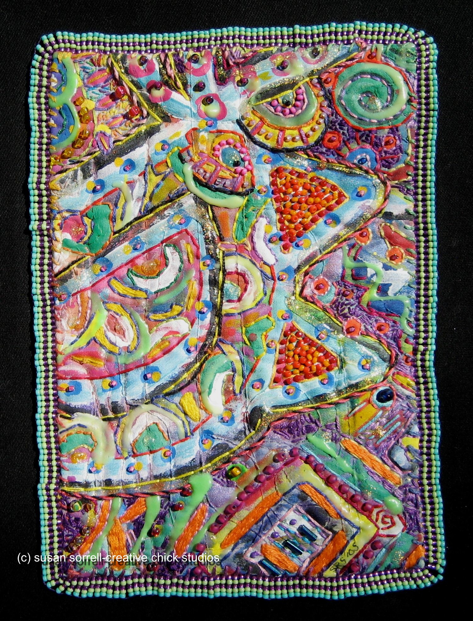 8 1/2" x 5 1/2" framed painting with hand embroidery and beading glow in the dark paint