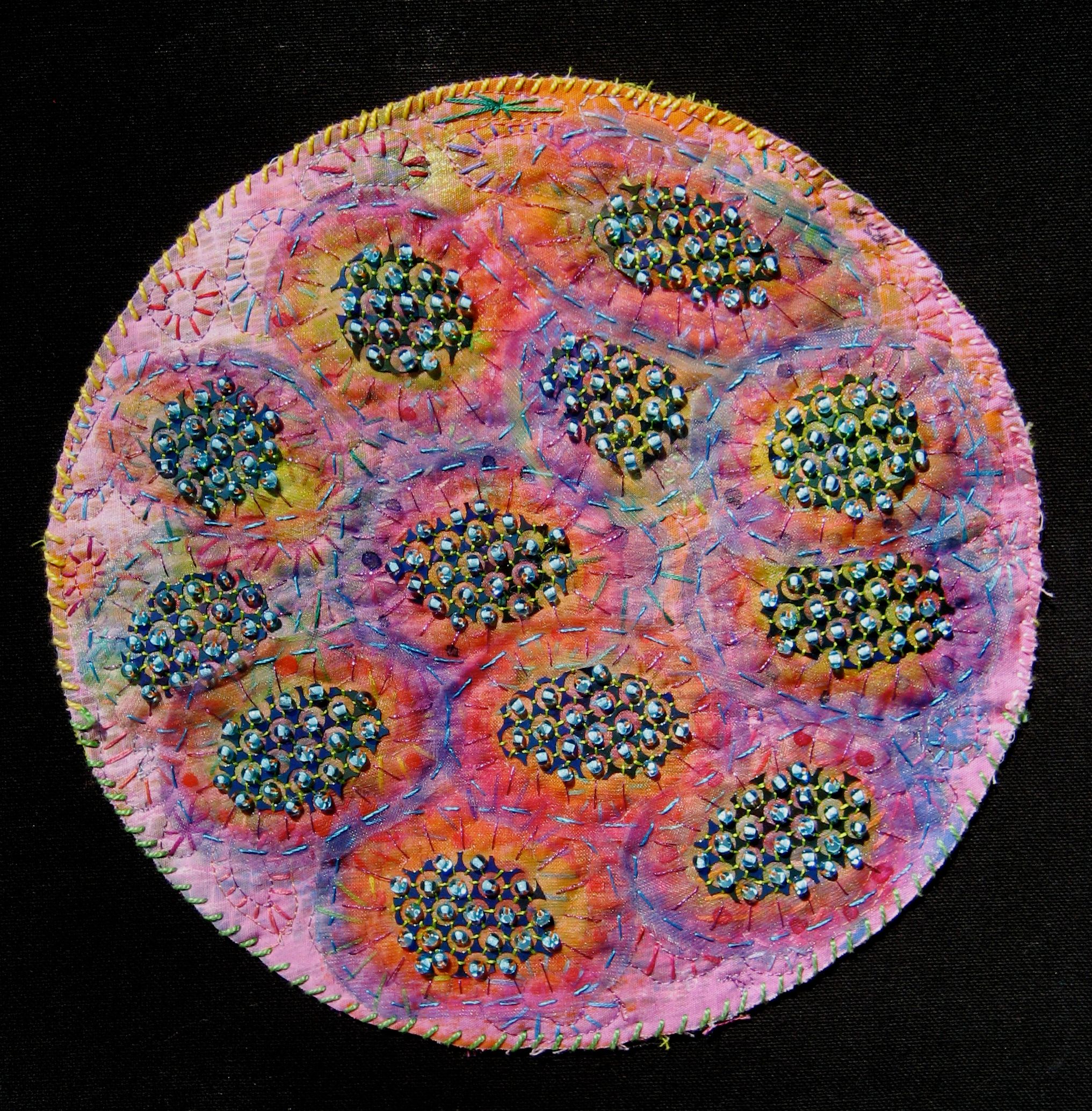12" x 9" round and framed hand embroidery, beading, dyed fabrics