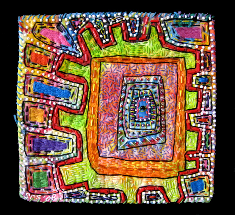 7" x 7 1/2" framed painting with hand embroidery and beading