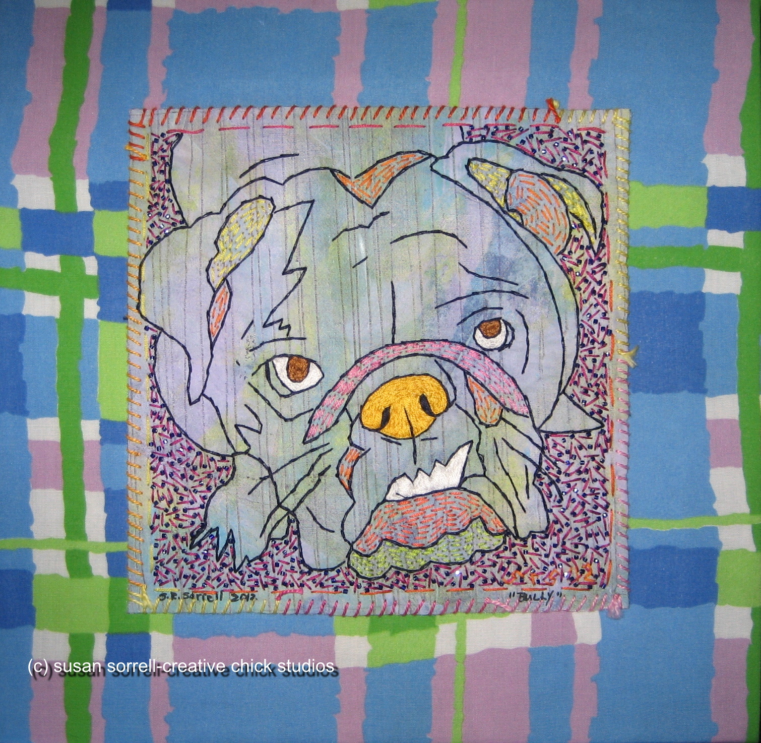 12" x 12" framed hand embroidery on painting with beading, mounted on fabric