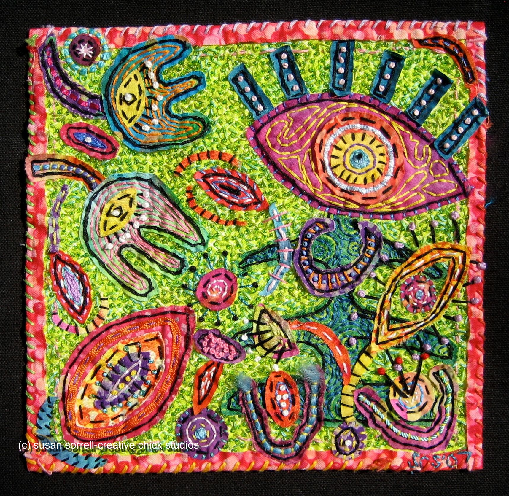 7 1/2" x 7 1/2" framed mixed media with hand embroidery and beading